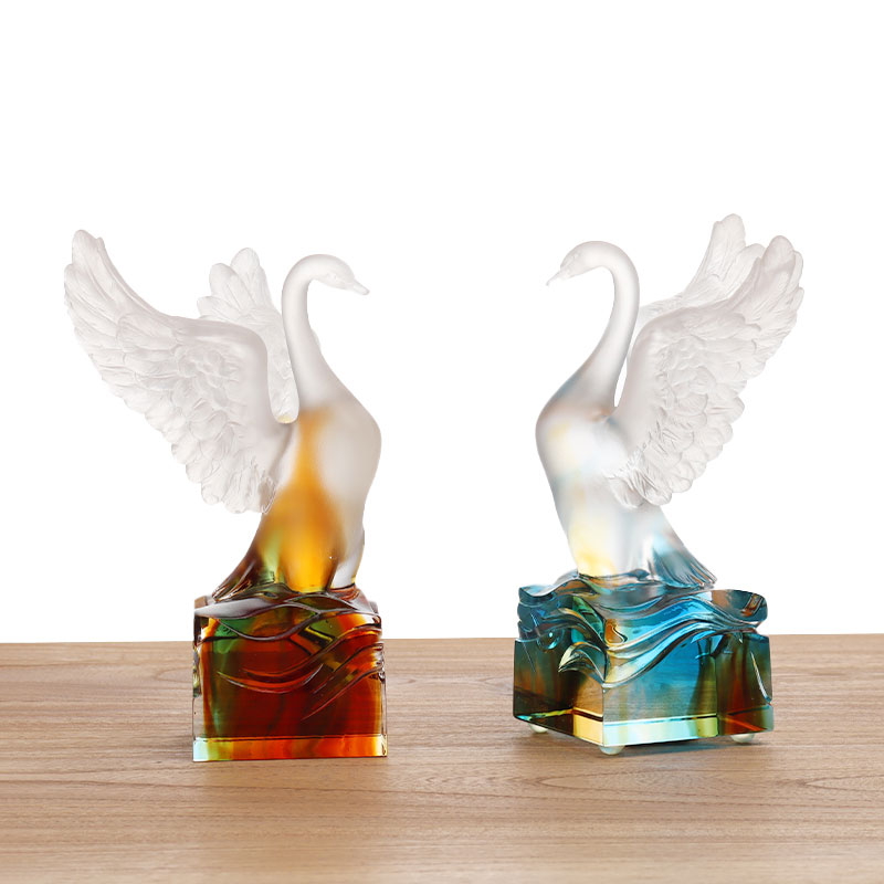 In termini di colore, il cigno di vetro adotta un design a colori sfumati, passando gradualmente dal bianco della testa al giallo-arancio del corpo e poi al rosso scuro della base. Questo cambiamento di colore non solo aumenta la stratificazione visiva, ma conferisce anche al cigno un temperamento caldo e solenne.