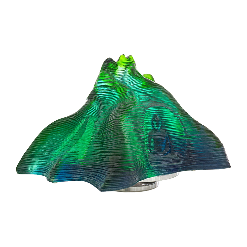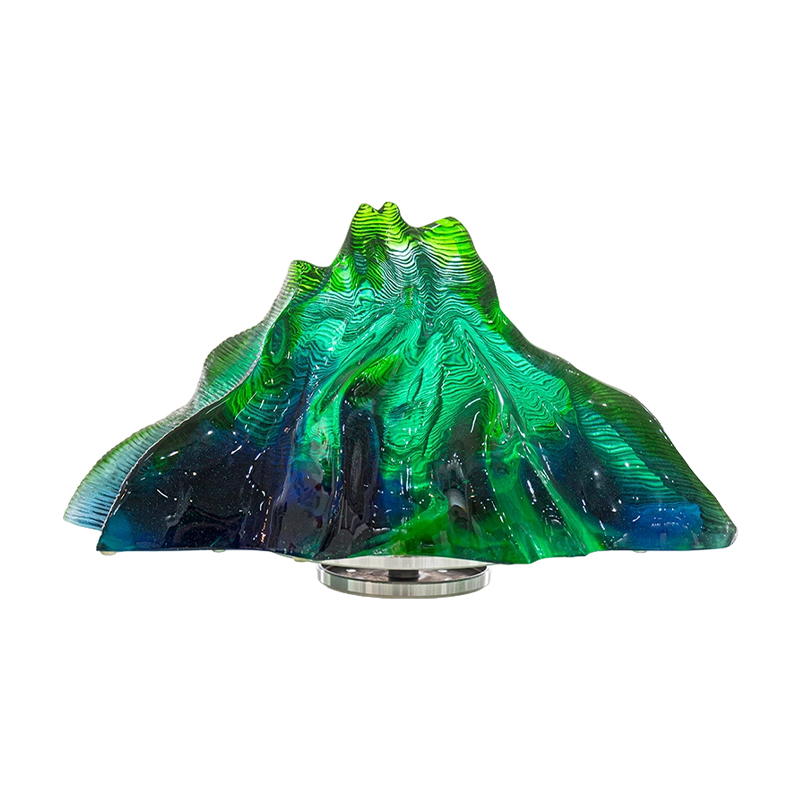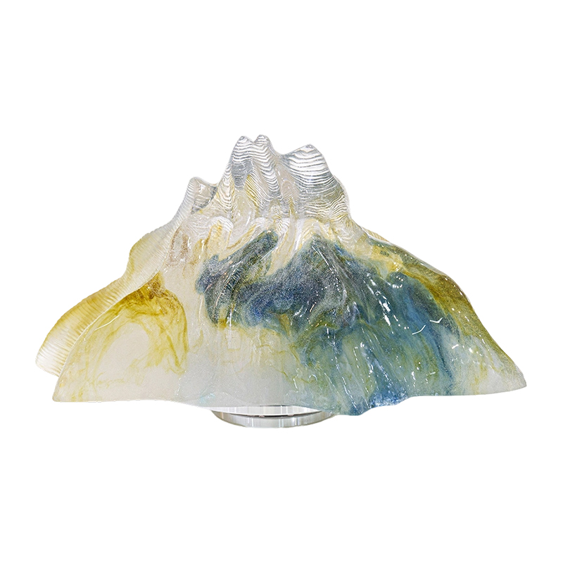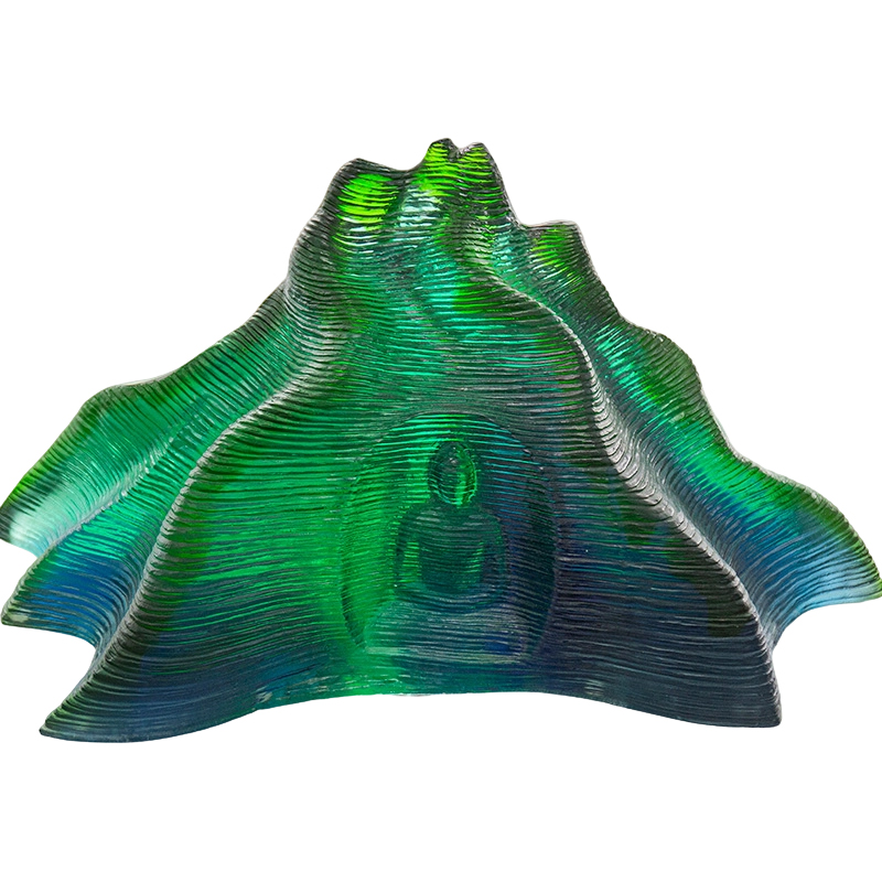 La trasparenza, le sfumature di colore e il gioco di luci e ombre nel cristallo fungono da “mezzo Zen” che collega passato e presente. La sfumatura dal verde verdeggiante al blu intenso trae ispirazione dalle foreste lussureggianti e dal tranquillo crepuscolo del monte Anyue, in risonanza con le immagini della tradizionale pittura di paesaggio blu-verde cinese, che utilizza le tonalità della natura per collegare il tempio rupestre con i ritmi del cielo e della terra. Mentre la luce permea il vetro stratificato, le sfumature si fondono e le illusioni si intrecciano, evocando il nebbioso splendore della nebbia dell'alba che avvolge le caverne. La coesistenza dialettica del "vuoto" del vetro (qualità traslucida) e del "colore" (toni freddi verde-blu) interpreta la massima intuizione filosofica del Buddismo: "il vuoto è forma, la forma è vuoto". Mentre luce e ombra scorrono attraverso superfici curve, le forme delle montagne e le sagome del Buddha cambiano continuamente, conferendo alla scultura statica "un istante che è eternità" - evocando la profonda tranquillità distillata da millenni di vento e pioggia sulla pietra di Anyue intagli.